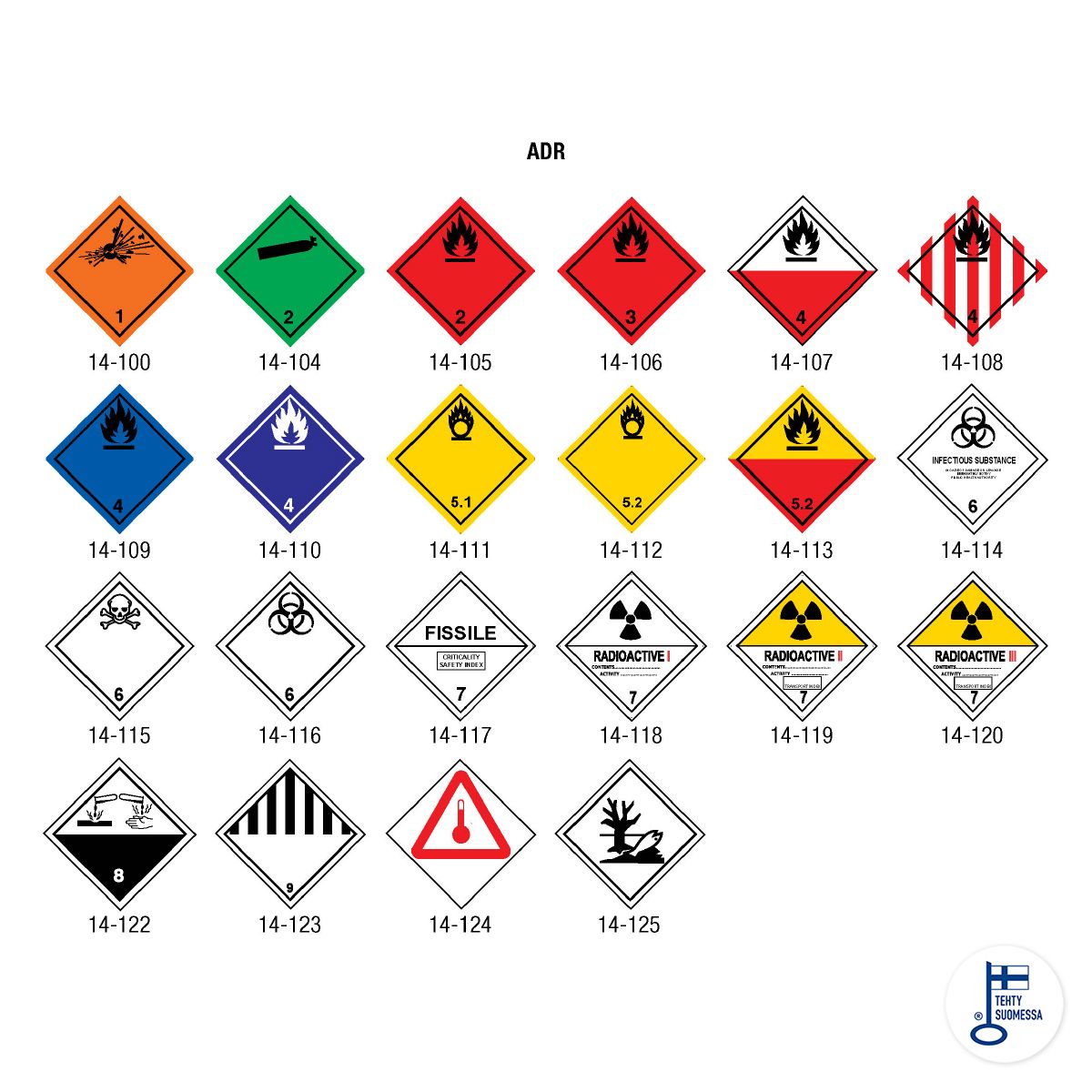 ADR-ohutusmärgised ehk ohtlike ainete veoks maanteetranspordis kasutatavad märgised. Valige rippmenüüst sobiv valik ja sisestage plahvatusohtlike ainete klassifitseerimisteave. Valikus on ka mitmesuguseid materjale ja suurusi. Valige oma vajadustele sobiv! Materjali ja suuruse valimise juhised leiate allpool.