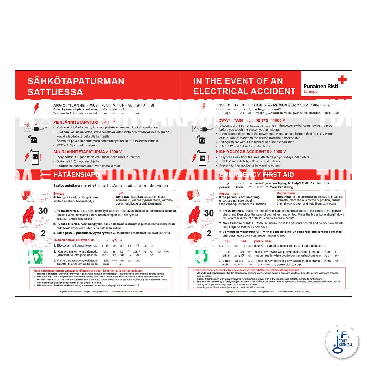 Juhised elektriõnnetuse korral FI ja ENG, mitmesugused materjalid ja suurused. Valige oma vajadustele sobiv! Materjali ja suuruse valiku juhised leiate allpool.