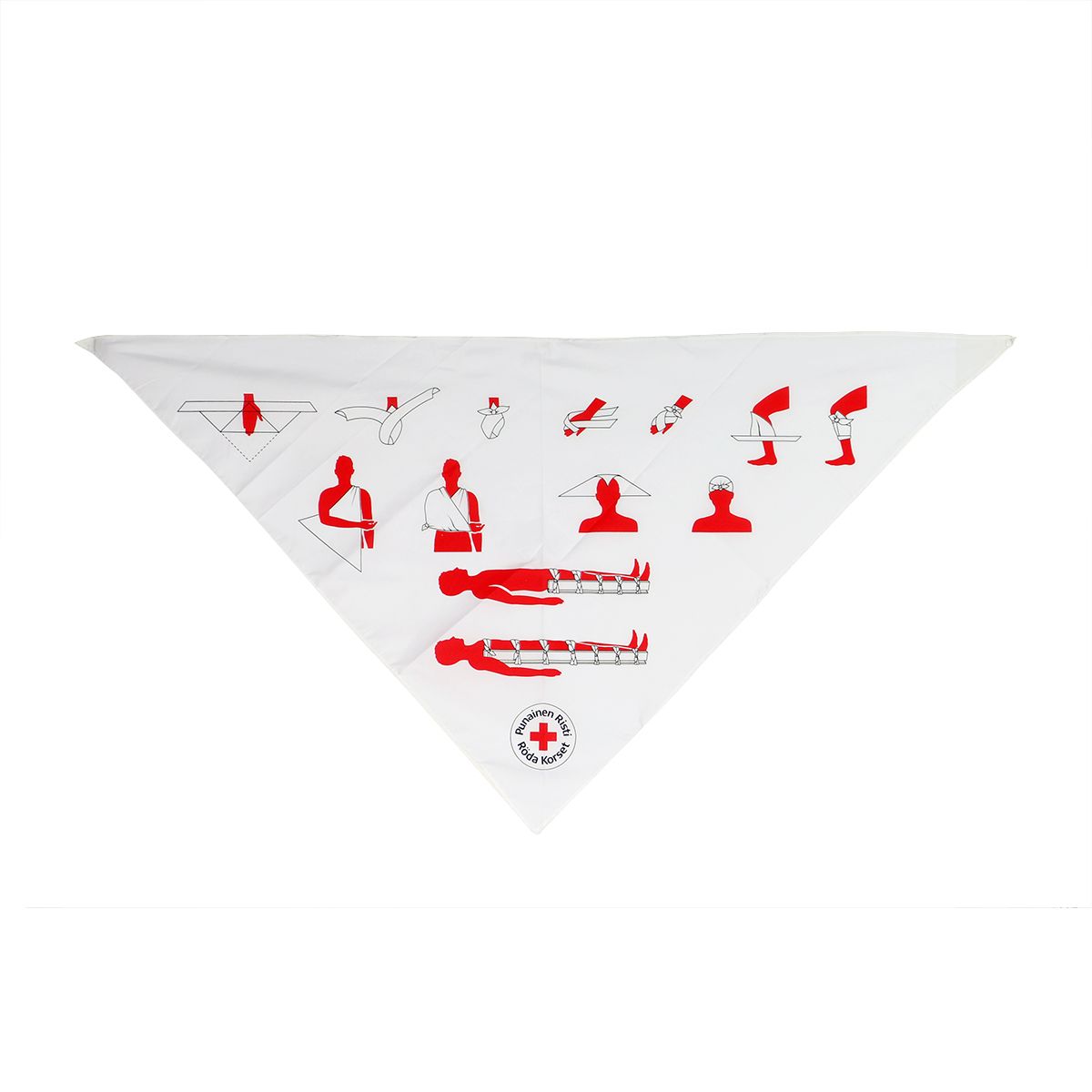 Puuvillakangast kolmnurkne rätik, millel on trükitud Punase Risti juhised.