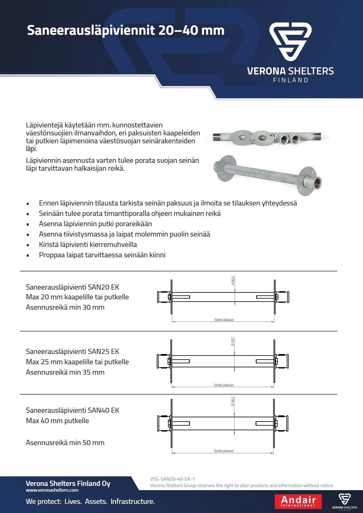 Läbiviigu paigaldamiseks tuleb puurida varjendi seina vajalikku läbimõõtu auk. Täpsemad andmed on vastava toote kaardil.