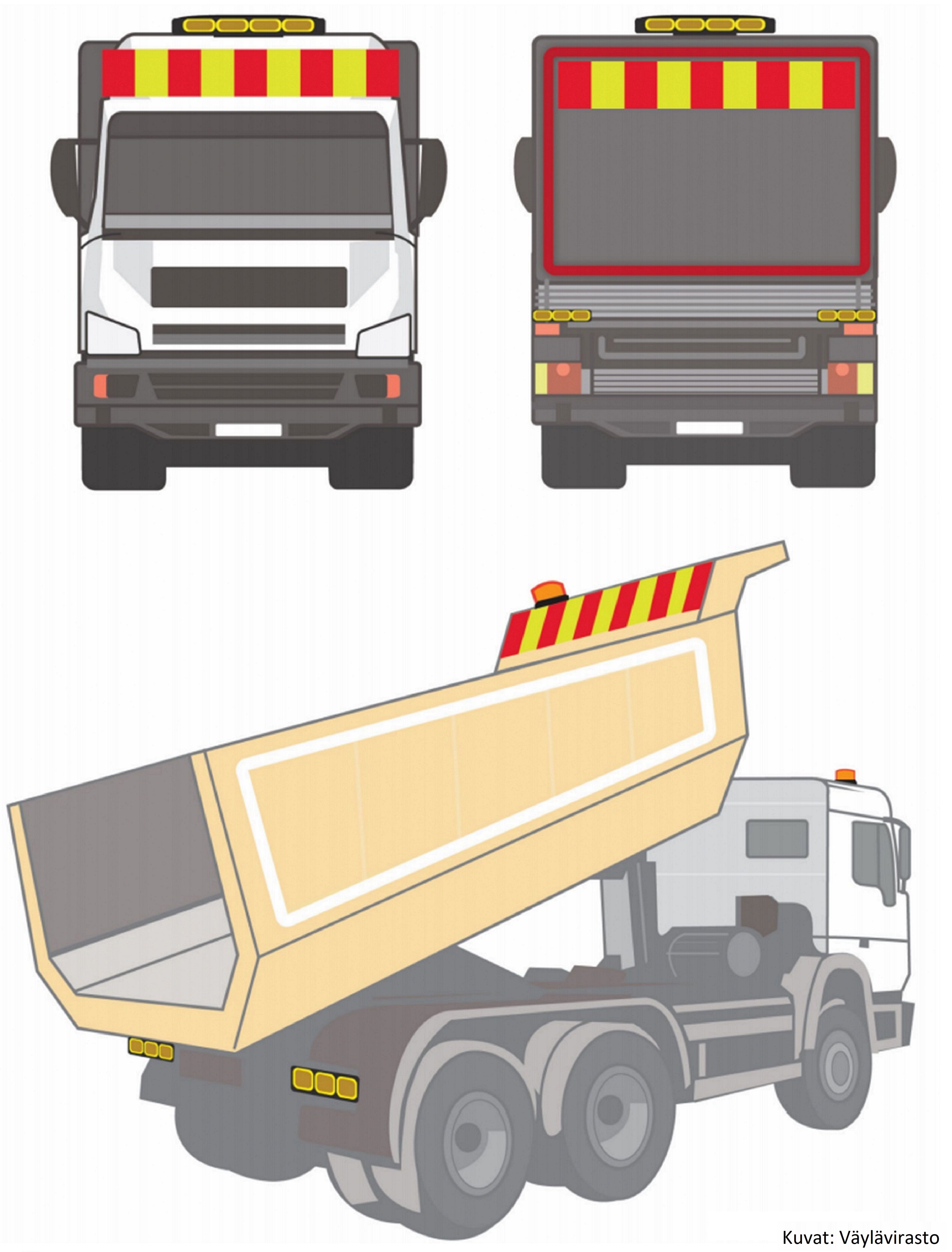 Hoiatusmärk koosneb vaheldumisi punastest ja kollastest vertikaalsetest triipudest, mille laius peab olema 100–500 mm. Hoiatusmärgi äärealadel olevad triibud on alati punased ning kollased osad peavad olema nn laimivärvi päevavalguse helendavast kilega. Hoiatusmärgid peavad olema nähtavad iga masina olulisimates suundades.
